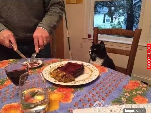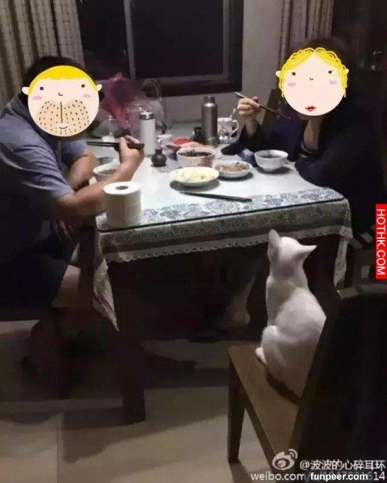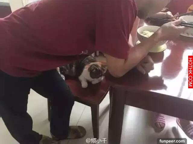 ▼吃飯時候貓坐位子上了,我爸就站著吃。