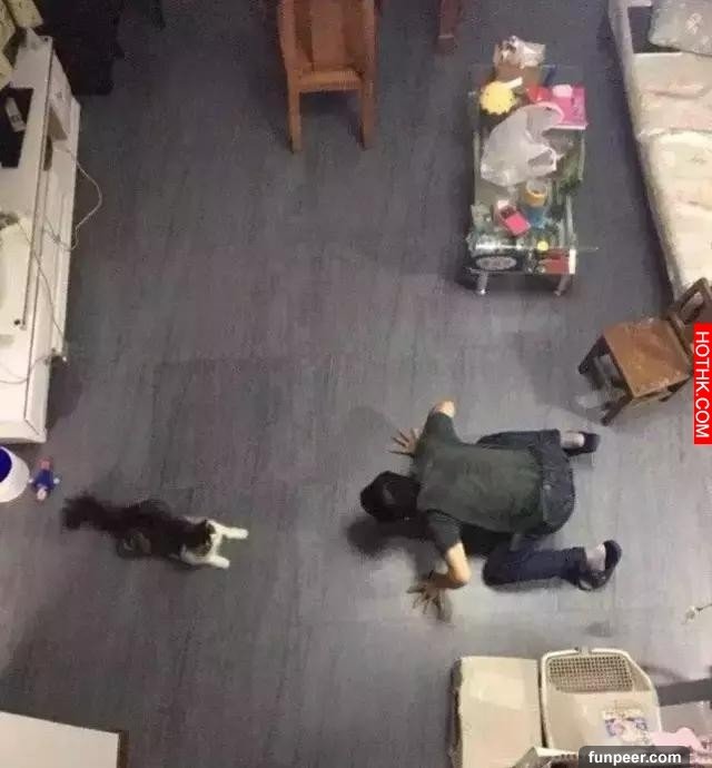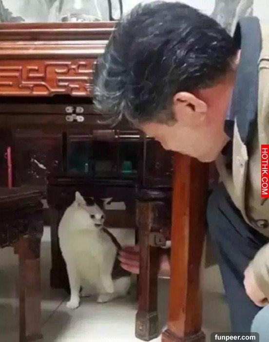 ▼我爸蹲地上問貓,寶貝誰惹你不開心了