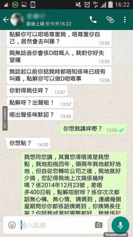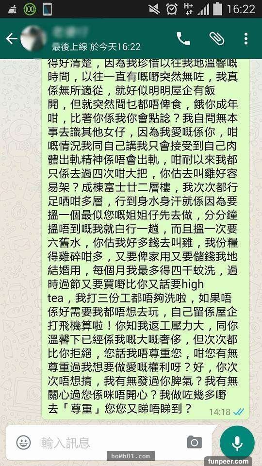 ▼面對女友的指責,他開始講述心中的委屈。女友:「為什么你這么不尊重我,不尊重你自己,居然會去嫖妓?我不知道你竟然是這樣的人,我對你很失望!你以前碰我的時候都不曉得是不是已經有過嫖妓經驗,為什么會做這樣的事?你對得起我嗎?說話啊,不出聲就是默認了?」 網友:「你想要我講什么?」女友:「你想怎樣?」網友:「我想跟你說,我們戀愛4年,前兩年還好,但自從你換工作之后,我們就再也沒有機會親熱了。你還記得我們上次親熱是什么時候嗎?是2014年12月23日,差不多有400天了。你每次都說沒心情、生理期,連續幾個星期問你你都說生理期,你的「大姨媽」是常駐不會走嗎?你說我變態也沒關系,這些我都記得很清楚。」