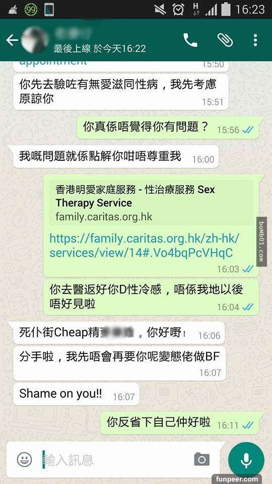 ▼他之后氣炸了,反駁要讓女友去檢查有沒有性冷感。網友:「你先去治好你的性冷感,不然我們以后也不用再見了。」女友:「去死吧賤男!分手!我不會再要你這樣的變態做男友!你真丟臉!」網友:「你自己反省下吧。」
