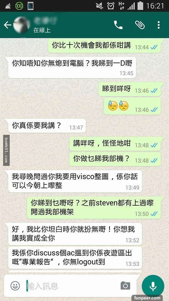 ▼見他不愿意坦白,女友開始提醒,說用過他的電腦。但他還在垂死掙扎,女友直接告訴他看到了「事后報告」。網友:「你再給我10次機會我都是這樣說。」女友:「你知道你沒有關電腦嗎?我看到一些東西。」網友:「看到什么?」女友:「你真的要我講出來嗎?」網友:「講什么啊,你說話怪怪的。你為什么看我的電腦?」女友:「我昨晚跟你說過我要用你的電腦,你說可以今天早上可以來用。」網友:「你看到什么啊?之前Steven也有用過這架電腦啊。」女友:「好,我給你機會坦白你就裝無辜,你想讓我說那我就成全你。我看到你在網路論壇上寫的嫖妓事后報告,你忘記登出了。」
