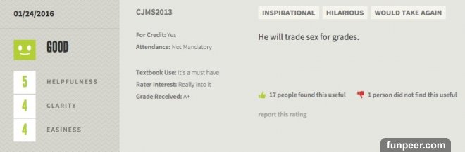 不過Chris並沒有像大多數男人那樣當場痛打小王,而是發揮「會笑就不會哭」的精神,將眼前這幕PO上Snapchat,寫道「我回家本來要給女友一個驚喜,結果…」,結果這則貼文榮登Snapchat 2016年人氣最火紅貼文之一。藍瘦香菇啊… 2. 這名教授 (還是叫獸) 大喇喇在他的線上「教學評量」頁面標明:「他接受用性愛換取分數」。