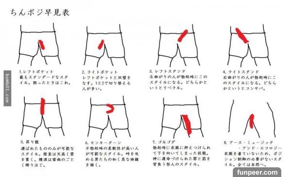 相信男生們一定都體驗過走路走一走忽然需要「調整一下」的感覺,但是你知道其實「調整小兄弟」也是有很大的學問的嗎?一位日本網友簡單整理出8大種最常見的小兄弟擺放方式,他用簡單的線條就精闢地畫出男生們褲子內的秘密,讓網友們看了都不停笑著說「真是太有趣了!」 小兄弟擺放方式: