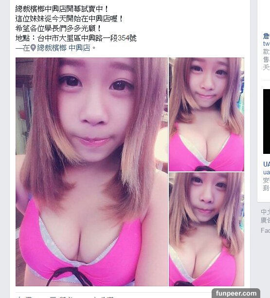 台中檳榔店開幕試賣,邀請了一位超正的爆乳檳榔妹助陣,完全是青春的肉體啊,目測最多20歲,有網友就在底下留言跪求FB,不知道有沒去過,或者有在附近的卡友可以去朝聖拍照XDDD