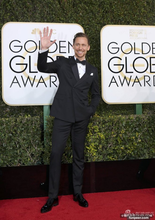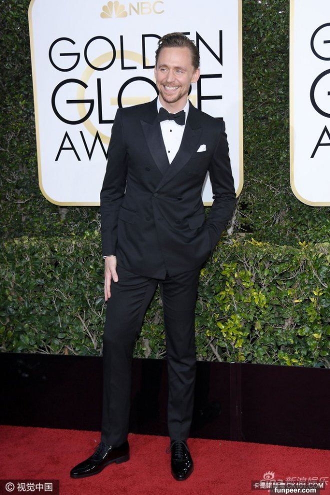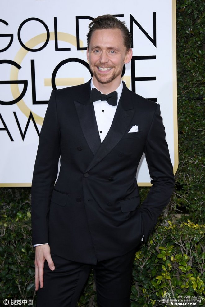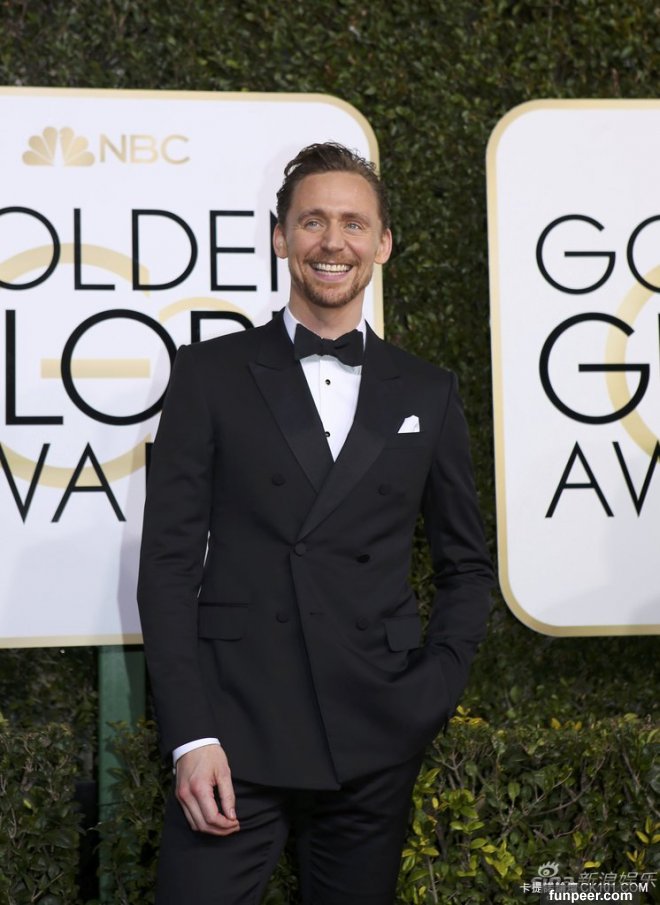 湯姆·希德斯頓西裝領結露標誌性笑容