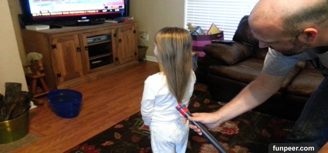 ▼面對長髮的小公主,爸爸們學會了使用吸塵器,真是感人。