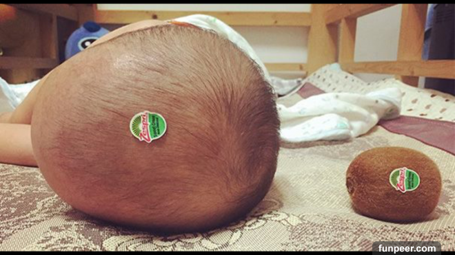 ▼當寶寶睡著,爸爸看著這圓圓的腦忍不住貼上了奇異果的標籤!