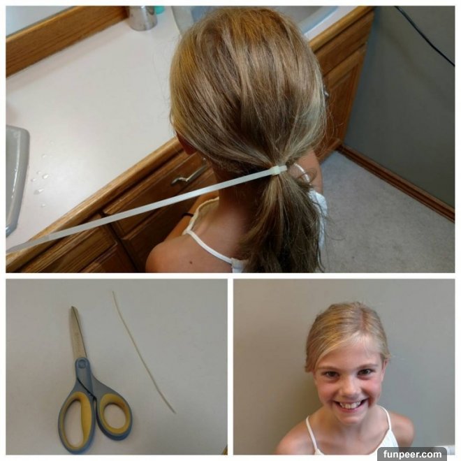 ▼給「小公主」扎馬尾誰說只能用髮圈,綁鐵絲的紮帶對於爸爸們來說更順手。