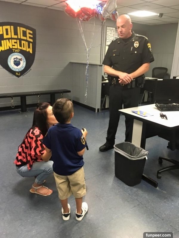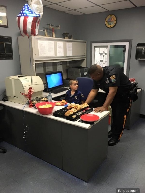 ▲警方與小男孩的紀念留影,感動數萬網友。大家都不太記得小時候的零用錢都拿去做什麼了吧?但是有位5歲的小男孩,清楚知道自己要拿零用錢來做什麼,就是要拿來做善事。 根據外媒abc7ny報導,美國有一名小男孩名叫小威廉,他想做盡各種好事。而其中一件好事就是請警察叔叔吃午餐,因為他覺得「警察叔叔連小男孩自己都在睡覺的時候,也在保護他的安全。」 所以在小威廉存了5個月的零用錢之後,小威廉特地買了Subway的潛艇堡跟點心送到警局,因為他希望警察叔叔吃得健康。警局裡所有的警察都被小男孩的心意深深地感動。最後警局也封小威廉為榮譽警官,給他特別的制服跟徽章,最後還用警車鳴笛載他回家!▼初來乍到的小男孩,一到警察局就馬上表明自己的來意,讓警察非常吃驚。