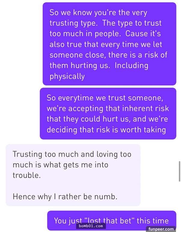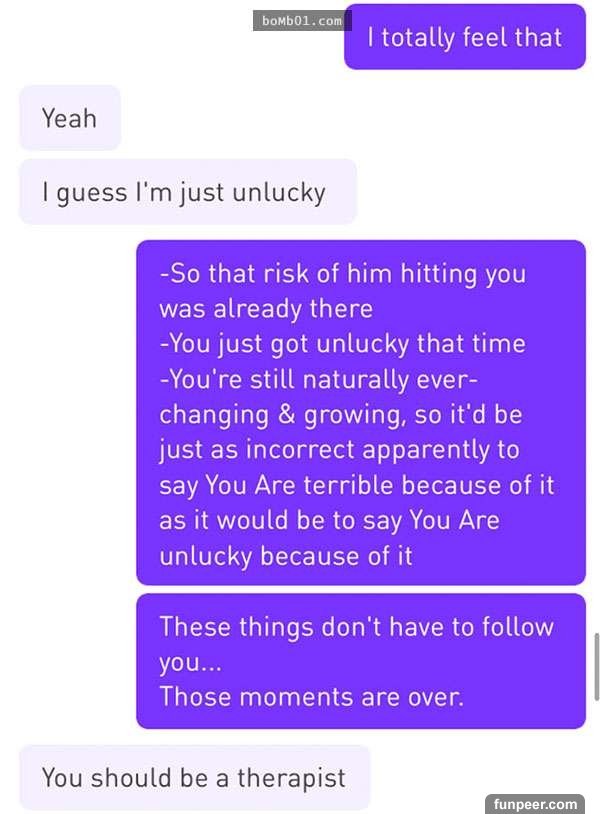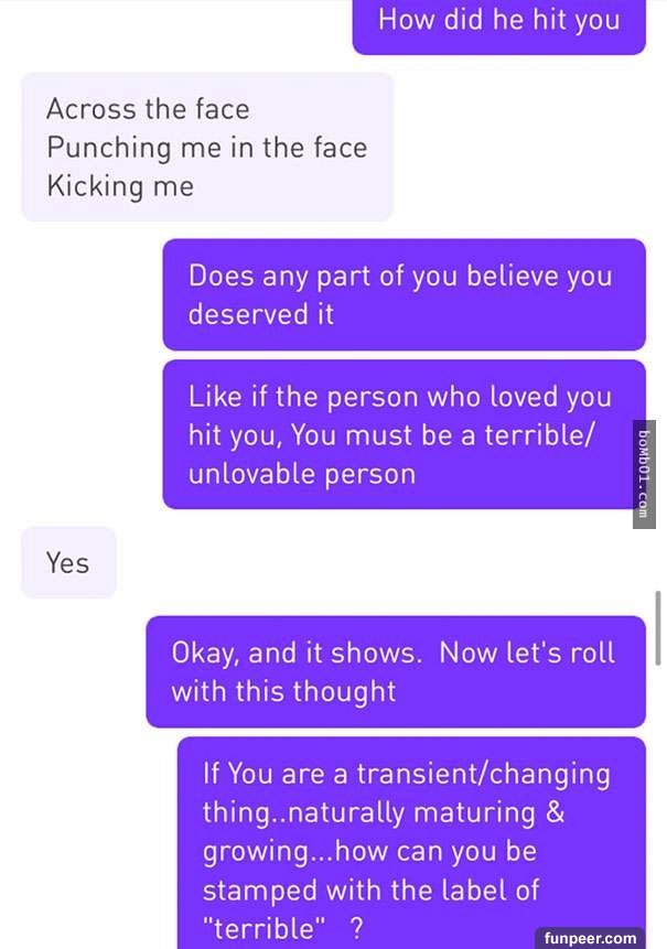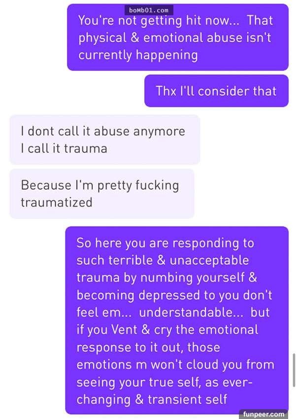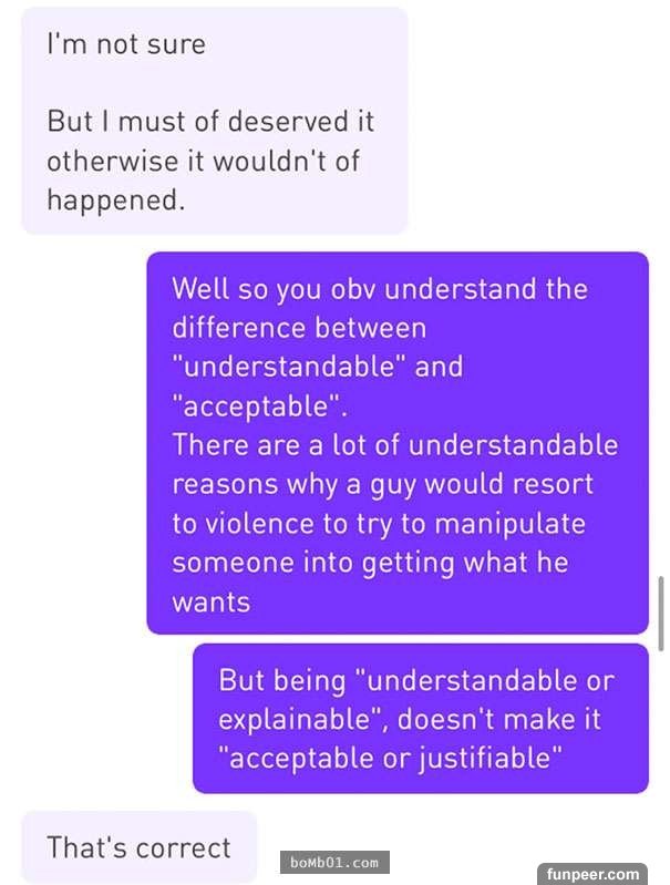 ▼女孩:我不確定,但一定是因為我的錯,不然這種事不會發生的。網友:你知道「理解」和「接受」之間的差別吧。一個男人使用暴力的原因有很多,這些都能理解,但這不能被接受。你是那種很容易信任別人的類型,總是無條件相信別人。我們都知道,每次讓別人靠近自己都可能受傷,包括身體上的傷害。每次我們選擇信任別人的時候,也接受了這種風險,因為我們覺得,冒這個險是值得的。女孩:太信任、付出太多愛就是我麻煩纏身的原因,所以我才想要麻痹自己呀。網友:這次你只不過是賭輸了。他對你的傷害已經發生了,這次你運氣很差,但你還是個不斷改變的個體啊。所以說自己「很糟糕」不對,只是「運氣差」罷了。那些糟糕的事已經過去了,你不會再被傷害,那些身心上的折磨都不會再發生了。