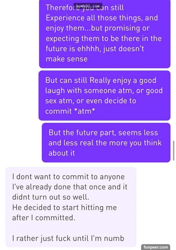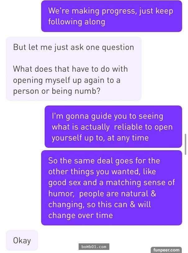 ▼女孩:我不想再和什麼人相愛了,這種事一次就夠了,結果太糟糕。我真心和他在一起,他卻打我,我現在只想要約火包麻痹自己。網友:他怎麼打你了?女孩:打我的臉,還踢我。網友:你覺得自己應該被這樣對待嗎?有些人會覺得,愛的人傷害自己,那麼自己一定很糟糕。女孩:是的。網友:明白了。現在我們看這個問題,如果你一直在變,怎麼可能一直貼著「很糟糕」這個標簽呢?