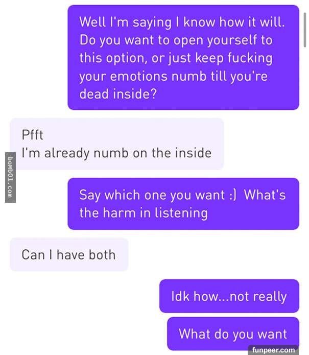 ▼網友:可能啊,為什麼不能!你是想要敞開心扉選真愛呢,還是約火包麻痹自己,直到徹底麻木?女孩:我的心已經麻木了。網友:就告訴我你想要哪個嘛~你怎麼被傷害了?女孩:能兩個都選嗎?網友:你真正想要的是什麼?