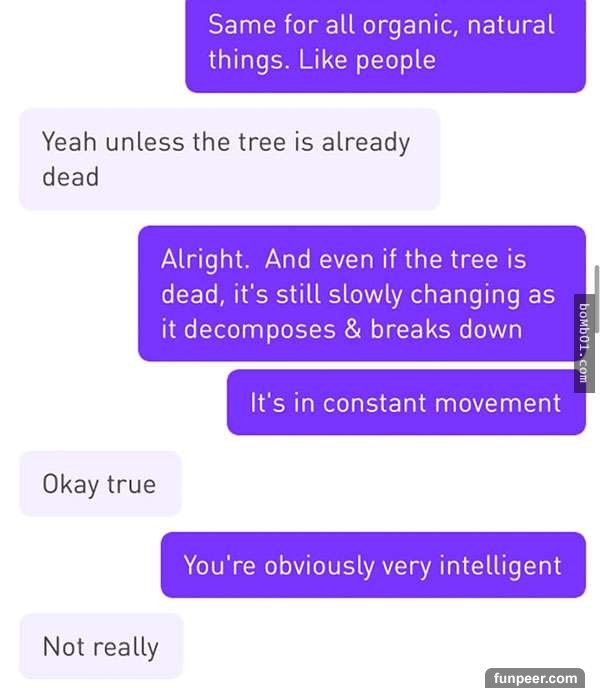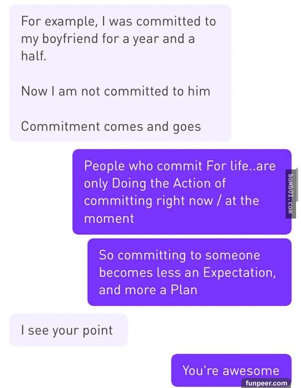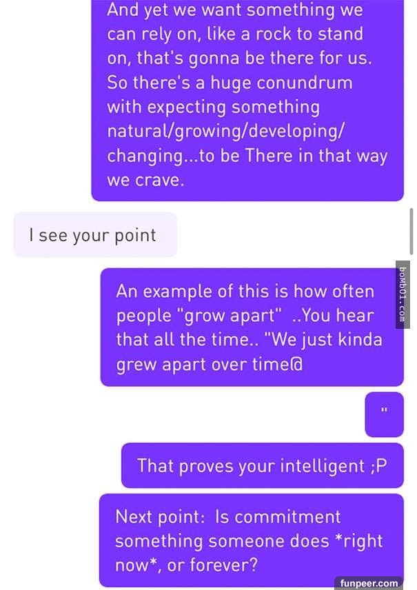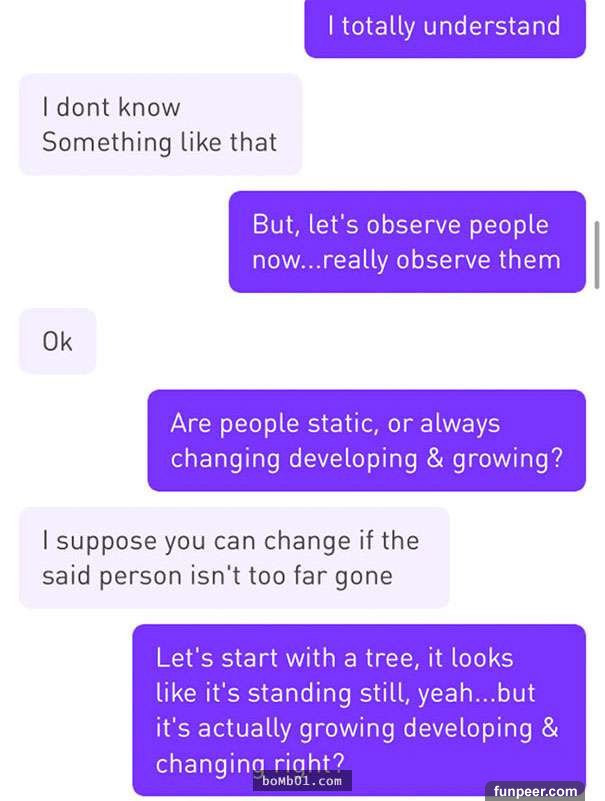 ▼網友:了解了。現在我們來透徹地觀察一下。你覺得人是永遠不變的,還是不停改變、成長的?比如說一棵樹,它一直在原地,但不停長大、改變,對吧?其他事物也一樣,人也是這樣。女孩:對,除非這棵樹死了。網友:就算死了它也會改變啊,還會腐爛、分解。世間萬物都在改變。但我們想要一些不變的,能夠帶來安全感的東西,所以這就有了一個大難題:我們希望那些永遠在變的東西不要改變。所以人們經常會產生隔閡、分手。女孩:我明白你的意思了。網友:你真的很聰明!來看下一個問題吧,諾言是對於現在的,還是永遠的呢?