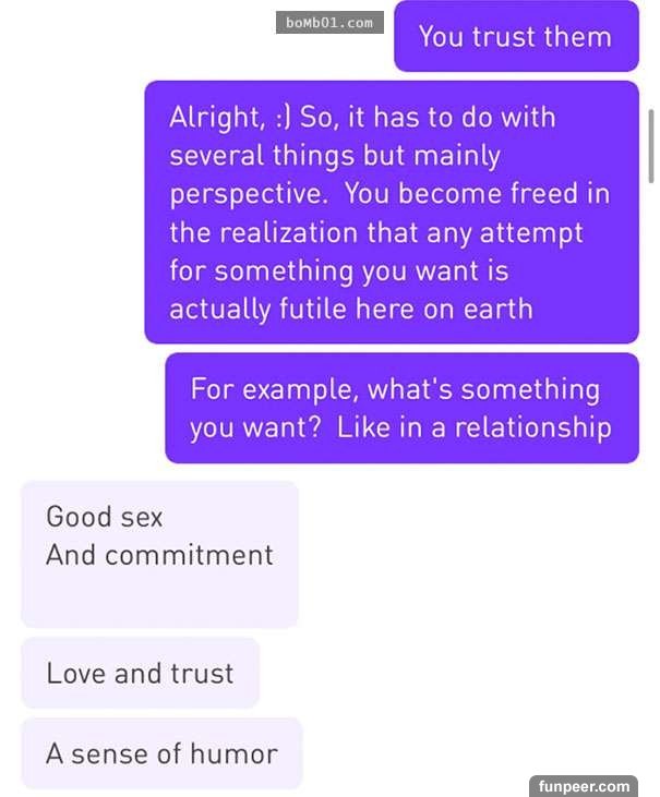 ▼女孩:第二個吧。我寧愿麻木也不要再傷心了。我付出了很多愛,最後卻是心碎。網友:我了解。你真正想要的是什麼呢?想要從戀愛中得到什麼?女孩:性福、承諾、愛、信任、幽默感之類的吧。