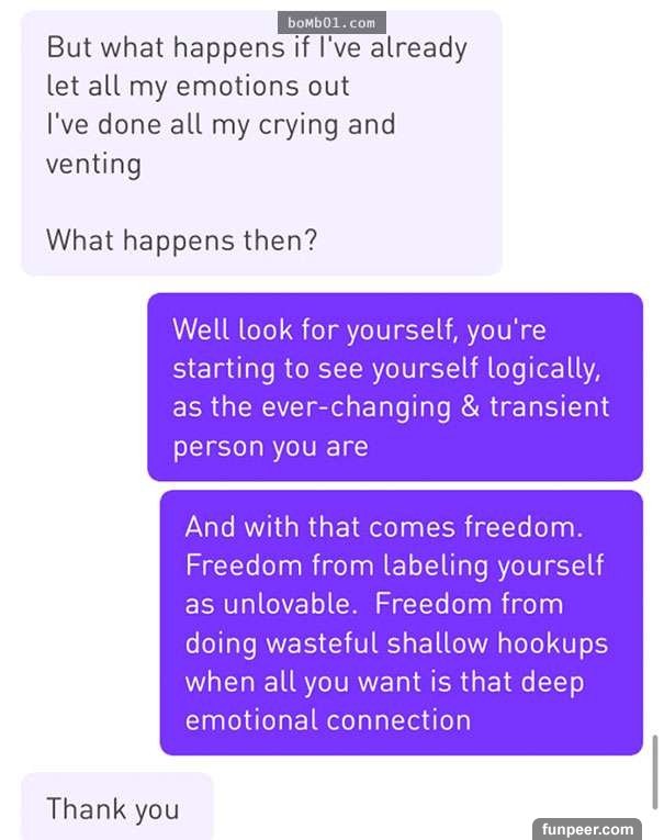 ▼女孩:我覺得說折磨不合適,這對我來說就是創傷,我精神受創很嚴重。網友:所以你麻痹自己應對那些創傷的話,會變得越來越糟。如果你把負面情緒釋放出來,它們就不會再影響你了。女孩:釋放過情緒之後呢?會怎麼樣?網友:那就要尋找真我了,你在不停改變,需要認識真正的自己,那時候你就會從沒資格被愛、約火包麻痹之類的坑中爬出來,你想要的只是真愛啊。女孩:謝謝你。網友:不客氣,我們這樣相遇也是緣分。除非你傾聽自己的心聲,否則我的話沒有任何意義。用心傾聽,因為你想要比現在更好。感謝你自己吧!