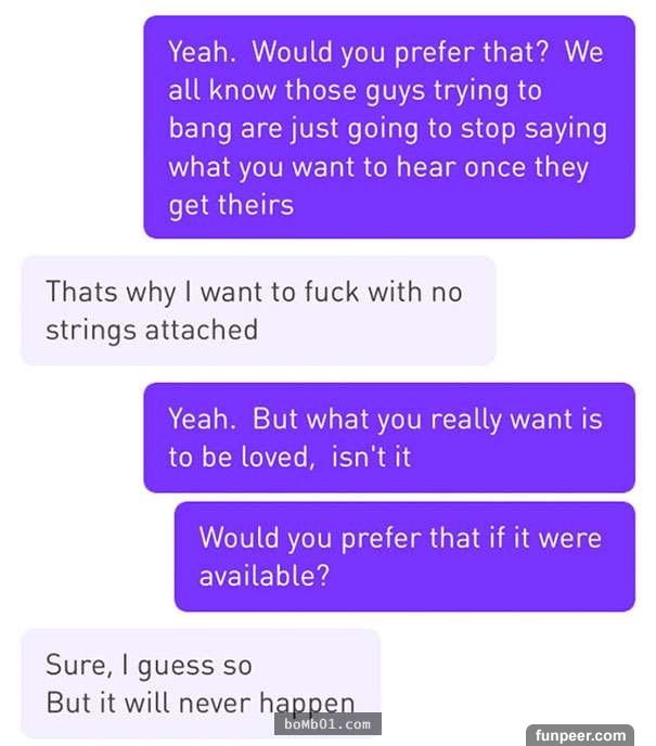 ▼網友:你真的要這麼干嗎?那些約火包的人上過床就不會再說好聽的話了。女孩:所以我才只想要單純的約火包。網友:好吧,但你真正想要的是被愛,不是嗎?真愛和約炮二選一的話,你會選真愛。女孩:當然,但再也不可能了。