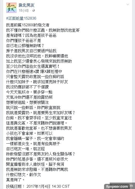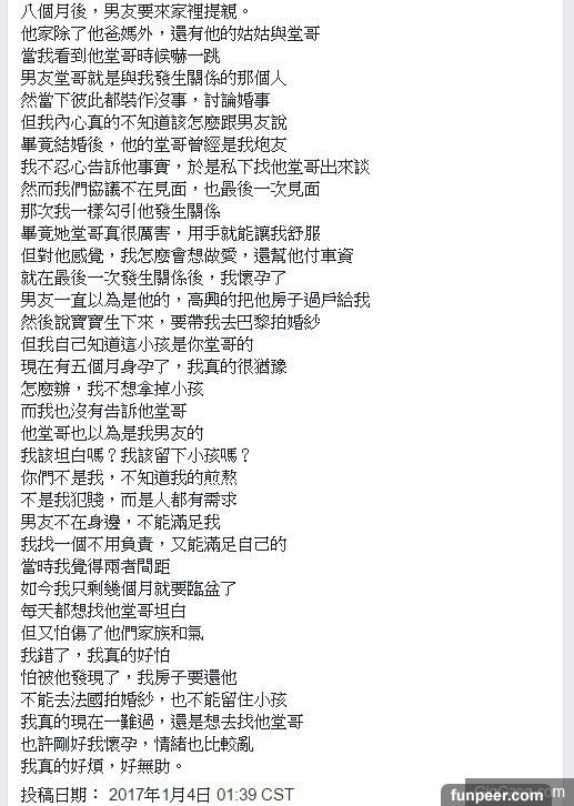 正牌男友以為孩子是自己的,興高采烈將房子過戶給她,還說寶寶生下來後要帶她去巴黎拍婚紗,讓她罪惡感深重,不知所措,因此PO文向網友求助,還表示「你們不是我,不知道我的煎熬;不是我犯賤,而是人都有需求」文章一PO出,網友幾乎一面倒批評這名女網友的行為「妳就犯賤啊!」、「你明顯有病、你男友很可憐耶」、「你他媽的出軌就出軌,找什麼理由?」、「sod都寫不出這種劇情…妳贏了」。 一天內,女網友又再度PO文,回擊網友的抨擊,「我不懂你們裝什麼正義,我無助想找他堂哥,是有錯嗎?」,還強調「房子是我男友自己要過戶給我,我沒求他也沒拜託他,我幹嘛要還他」,更反酸批評她的女網友們「就是有些臭婊子,自己x友一堆,裝正經,妳敢發誓沒跟不是男友的人發生關係嗎?」、「妳們的苞是多香,還不是照片修很大」,用詞十分火爆。