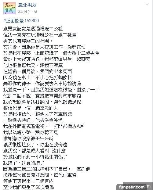 這名女網友昨日凌晨在臉書《靠北男友》發文,說明她與男友當初是在臉書社團《爆廢公社二》認識,另外她也有在玩《爆廢公社一》,並因此認識了大她12歲的男網友。由於男友大夜班沒空陪她,她耐不住寂寞和男網友越聊越熱絡,直到相約出來見面,男網友以打翻飲料為由想去旅館洗澡,「我在外面電視看電視,一打開卻播放謎片,我以為轉小聲一點你聽不見,誰知道你沒穿褲子出來時,讓我很尷尬極了。你坐在我旁邊跟我說,都是成人看謎片沒什麼,於是我們不到一小時發生關係了。」接下來的3個月內,兩人更是天雷勾動地火,一共床戰50次。