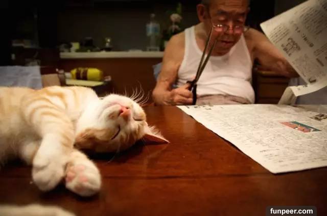 Kinako也很粘他,有時候爺爺睡著了,這個喵星人還坐在旁邊守著不捨得離開。