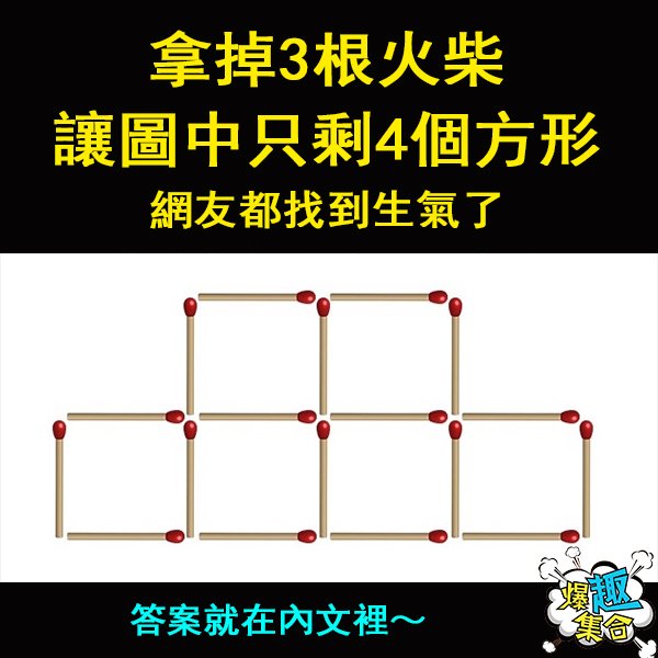 「拿掉3根火柴讓方形變成4個」,智商高的人才能解出來,你答對了嗎?