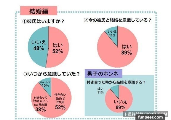 至於有關「結婚」的統計結果,竟然有52%認為交往3個月就表示可以與對方結婚,38%需要3到6個月來確定是否結婚,10%則是一見鍾情,一見面就認定可與對方結婚。整體來說,高達89%的女性抱持跟目前男友結婚的打算。有趣的是,他們還特別調查了男性意願,發現這個年齡層的男性還不想結婚的比率竟然高達89%,跟女性正好相反。多殘酷啊!