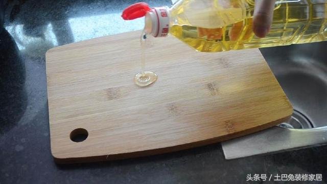 4、往菜板上倒入一些食用油,塗抹在菜板上,再放置陰涼處晾乾,反復塗抹3-4次。