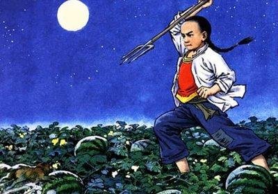 少年閏土在看守西瓜,用叉刺向猹