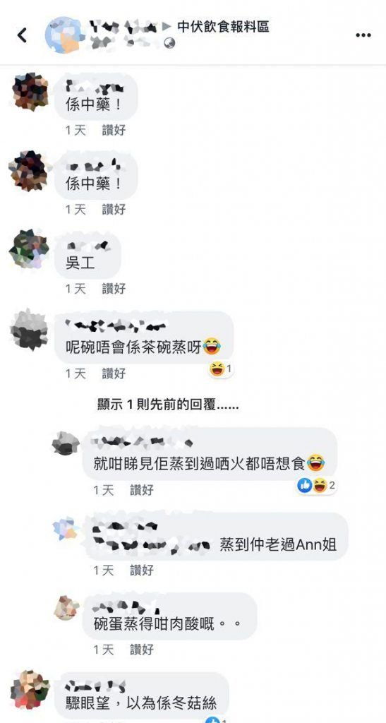 蛋中有一隻類似蜈蚣的黑色物體蜈蚣=中藥?防癌?不少網民見到樓主上傳的照片後,有人質疑樓主所點的到底是否茶碗蒸,並指:「呢碗唔會係茶碗蒸呀」、「碗蛋蒸得咁肉酸嘅」、「蒸得咁老嘅?」亦有網民嘲笑蜈蚣可進補:「係中藥!」、「中藥黎架,據稱防癌」更有網民笑指該菜式名為「廣東名菜禾虫蒸旦」、「元氣名菜蜈蚣蒸蛋」。