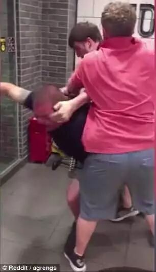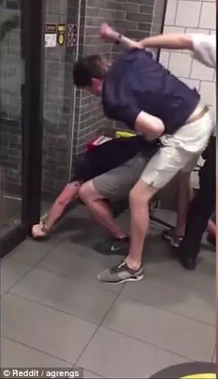 幾番推搡過後,中年男子突然抓住並扭動年輕人的胳膊,還拽著他的耳朵把他推到牆邊。之後,兩人扭打起來,場面逐漸變得十分暴力。原本被動的年輕人站起來,抓住中年男的襯衣並把他扔到牆上,還用拳頭猛擊中年男的頭。