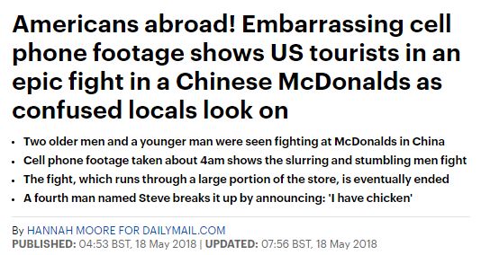 據英國《每日郵報》18日報導,一段手機視頻顯示,幾名美國遊客凌晨4點在中國深圳的一家麥當勞互相毆打。報導用“史詩級的戰鬥”來形容這一事件,並一再表示場面十分尷尬。