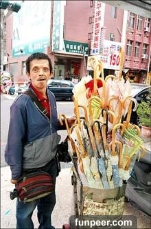 原來,他是今年53歲的張孝群伯伯,5歲時摔倒造成腦性麻痺,在小學2年級沒畢業,就靠著自學做手工傘賺錢生活。雖然因為腦麻的關係,說話很吃力,認識的字也不多,但他還是非常努力地向客人介紹商品,而每一支傘都是張孝群親手做的,品質掛保證!