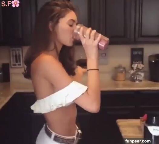 看倒牛奶、打果汁,隨著音樂不斷擺動她的水蛇腰和胸前雙峰