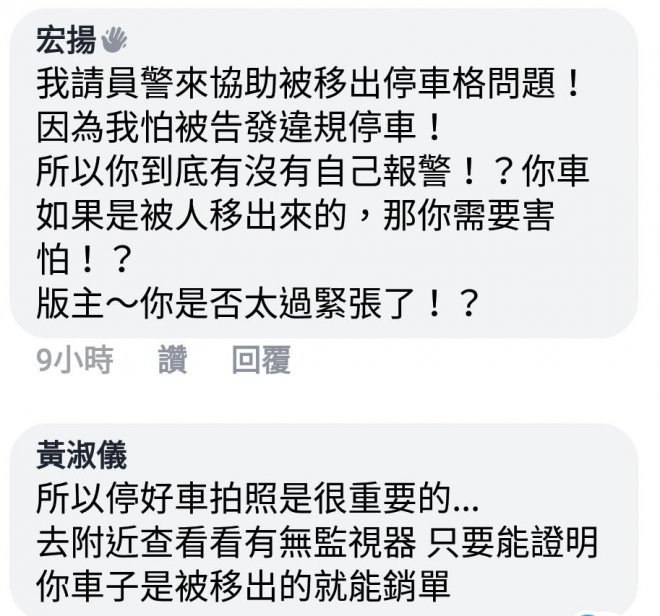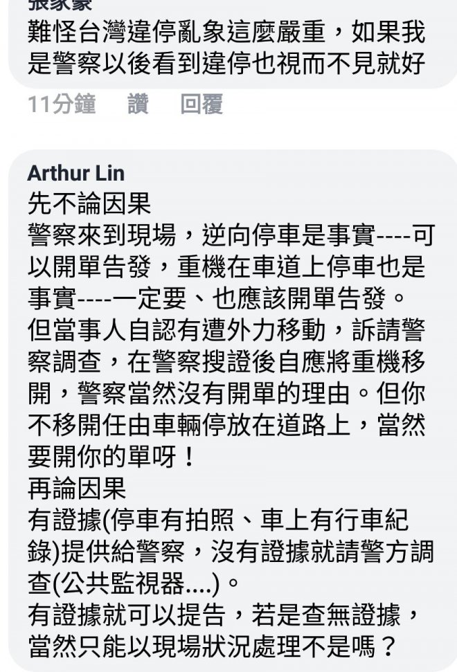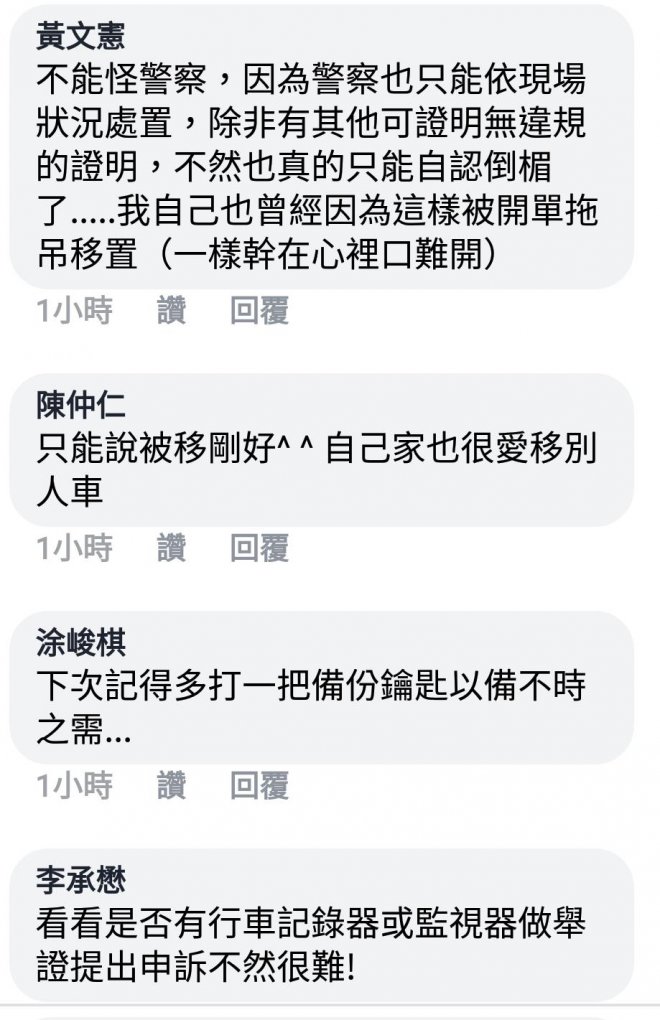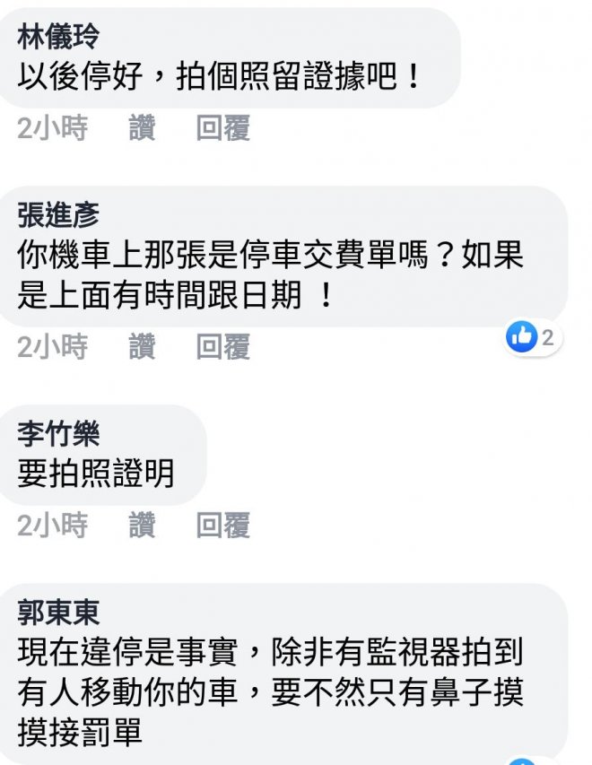 「我自己停路邊機車格,我也都會先拍照,避免其他人亂移車變成違規。我是認為警察開單是因為當下的事實,其他人不要故意亂扯警察的素質什麼的⋯⋯版主去調閱監視器後,才能申訴+檢舉那個可惡的移車人!」