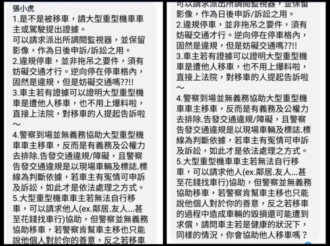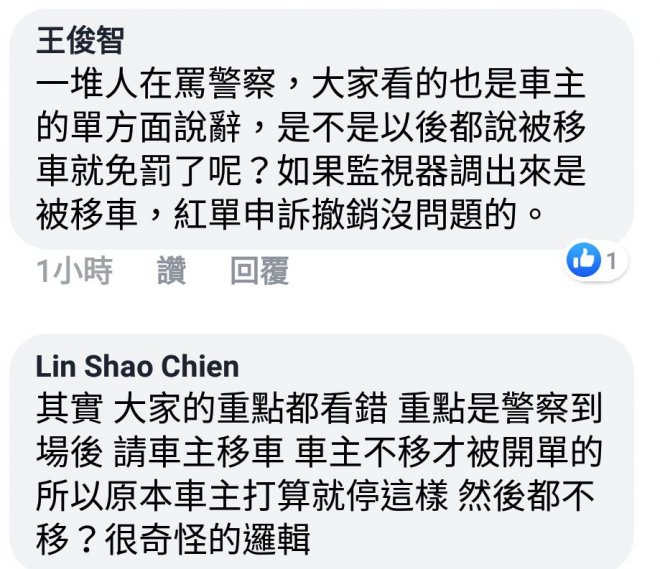 「『如果員警覺得有不妥當!他應該是協助我們處理事情吧!而不是消極的態度開單取締告發!』...怪警察不幫你?警察本來就沒有義務幫你吧!萬一幫你搬車有損傷是不是又要求償?找朋友、車行各種方法可以搬車怎麼不找?」