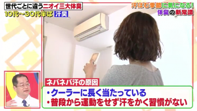 汗臭對策:少開冷氣多運動黏答答的汗是因為礦物質含量多而難乾,幫助了皮膚繁殖更多細菌。少開冷氣能減低身體排出黏答答的汗,多運動讓汗腺保持健康,使身體可以排出清爽的汗。