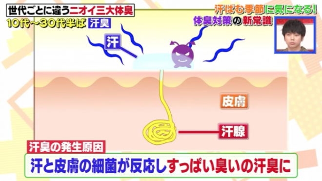 4類體臭成因與對策1 | 15-35歲 汗臭東海大學理學部化學科 關根嘉香教授指出,汗臭是分布全身,特別是腋下會有強勁的臭味,嗅起來酸酸的。汗臭的原因是腋下的汗腺比較集中,由汗腺排出的汗本來是無臭,而當汗與皮膚的細菌產生反應時,便變成酸臭。15-35歲的人新陳代謝較活躍、較多汗以致容易有汗臭。