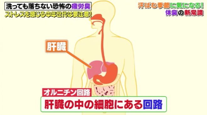 氨是人體內消除肌肉疲勞或腸內細菌運作時,分解蛋白質而大量產生出的成分,一般情況下會由肝臟分解氨做尿素,以尿液形式排出。如果過於疲勞便使肝臟機能降低,令未能分解的氨進入血液,循環在身體,然後經過皮膚的汗水、皮脂排出,形成「疲勞臭」。