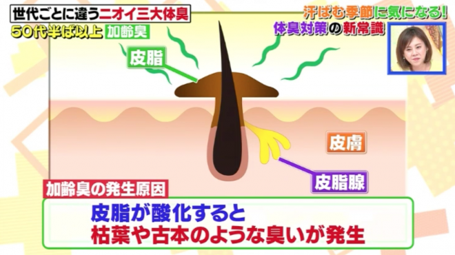 3 | 55歲以上 加齡臭(老人味)人體皮脂與汗水、老廢角質與Omega-7脂肪酸(棕櫚油酸和異油酸)經過酸化,分解成2-壬烯醛(2-Nonenal)物質,就是加齡臭的臭味來源。味道通常來自耳朵後面,但胸部、腹部、背部都也會產生。因為年輕人體內的抗氧化物質能防止體內細胞氧化,但當超過40歲後,細胞會因活性氧而氧化,令皮脂氧化加快,以致增加加齡臭的機率與程度。