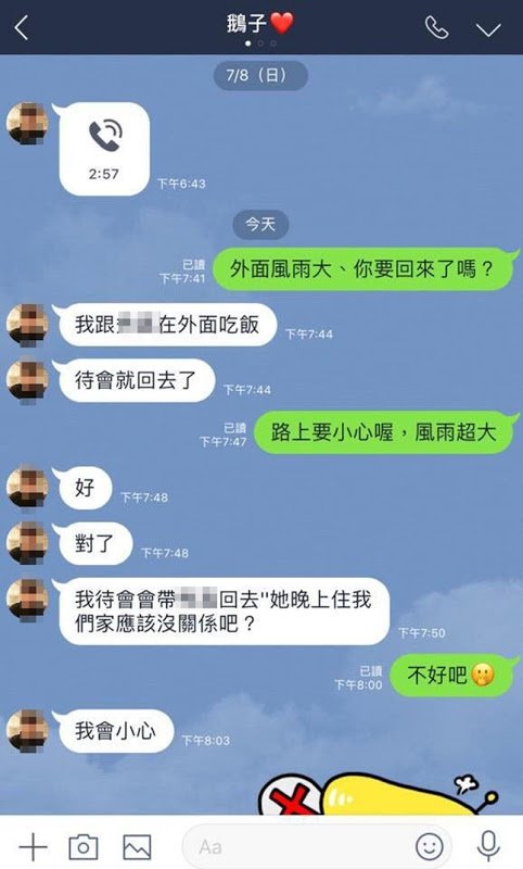 有女網友在「爆廢公社」PO文,提醒兒子外面風雨大,早點回家,結果兒子回應正在跟女友吃飯,並詢問老媽,待會帶女友回家「晚上住我們家應該