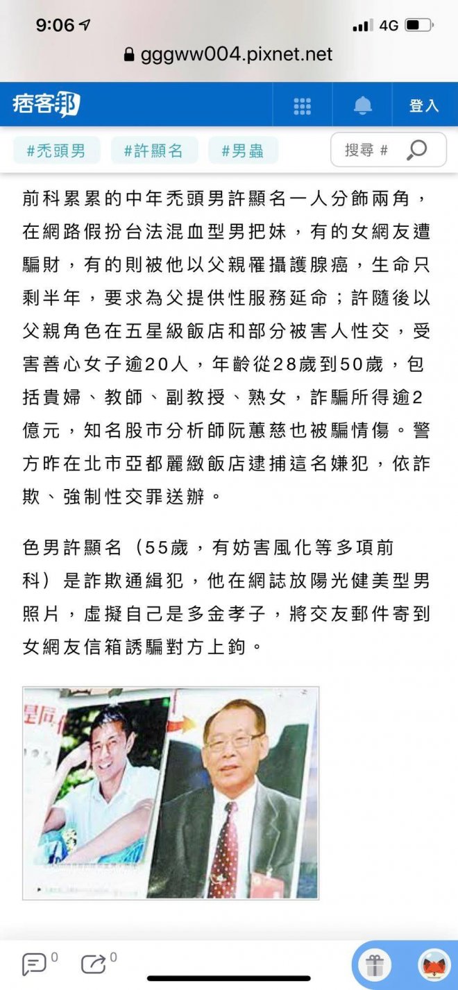 這個人的真實身份是【許顯*】他是一個曾經犯下11起性X案、並有常業詐欺、偽造文書、強盜、侵佔......等等前科,曾經轟動一時的超級垃圾大渣男,也就是您看到新聞照片中的噁心禿頭男!