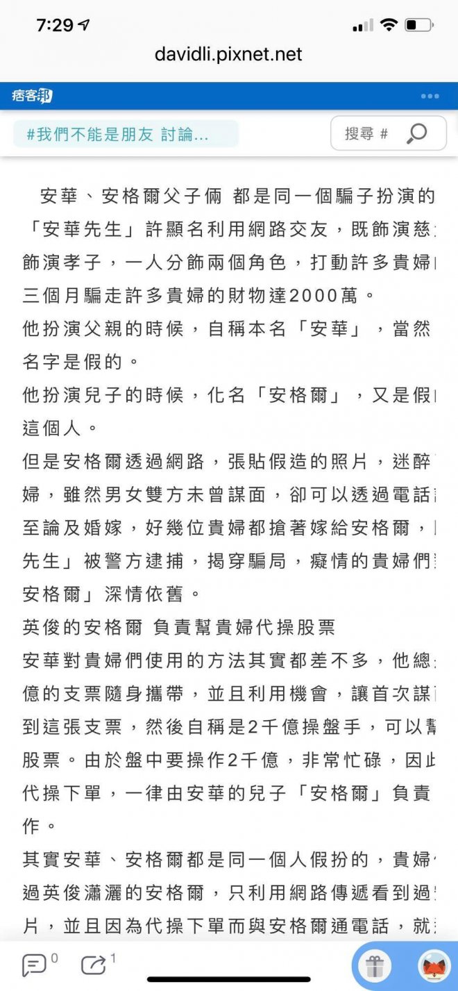 直到今年6月底,色男許*名的真實身分不小心曝光,我們才知道就連這些金控公司董事長、國內某國立大學校長、政界名人和大老闆們通通都是受害者,許*明以天使基金執行董事的假身分,假意要投資他們,或幫他們操作產品,不斷的以各種投資名目洗腦,讓他們上當受騙,這些商場老手、知識份子都被許顯名這個王八蛋騙的團團轉,