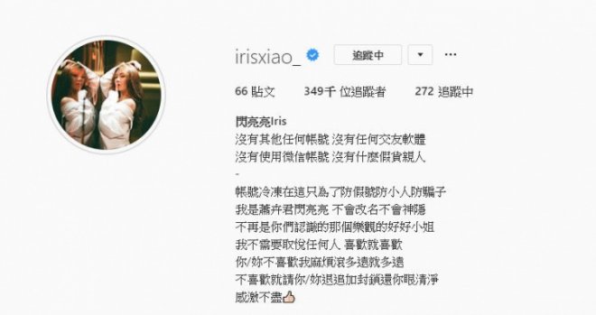 「沒有其他任何帳號,沒有任何交友軟體,沒有使用微信帳號,沒有什麼假貨親人。帳號冷凍在這只為了防假號防小人,我是蕭卉君閃亮亮,不會改名不會神隱,不再是你們認識的那個樂觀的好好小姐,我不需要取悅任何人,喜歡就喜歡,你/妳不喜歡我麻煩滾多遠就多遠,不喜歡就請你/妳退追加封鎖還你眼清淨,感激不盡」。