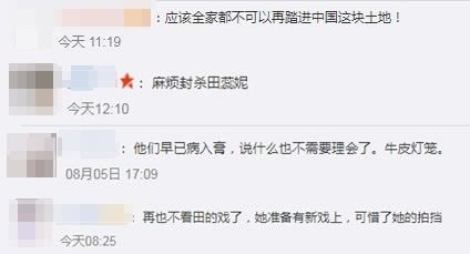 之不過,也有內地網民在微博狙擊阿田,指佢支持「港獨」,唔止要求TVB與她解約,更稱要罷睇其新劇《她她她的少女時代》,又話以後唔好踏足大陸賺人民幣。其實早前視后李佳芯(Ali)在微博表達意見後,則被內地網民斥責,並要求Alipay支付寶取消由Ali做香港代言人的資格。估唔到Ali被內地網民封殺後,今次輪到另一視后田蕊妮被圍攻。