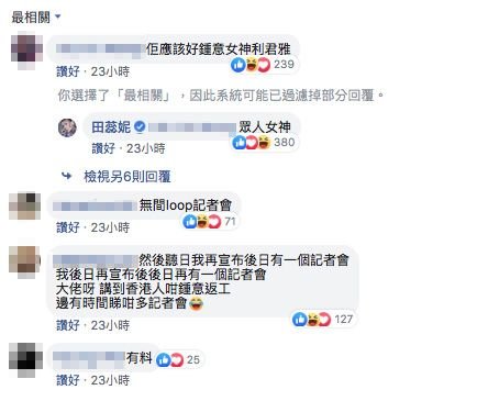 留言一出,有不少網民大讚阿田敢言,仲有網民話林鄭應該好鍾意利君雅,田蕊妮即回應話佢係眾人女神。