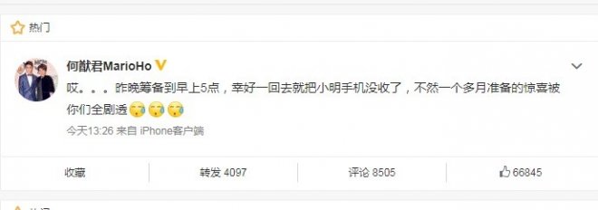 不過其實何猷君今天晚上才要準備求婚,消息卻提前曝光,讓他無奈在微博發文:「哎…昨晚籌備到早上5點,幸好一回去就把小明(奚夢瑤)手機沒收了,不然一個多月準備的驚喜被你們全劇透。」