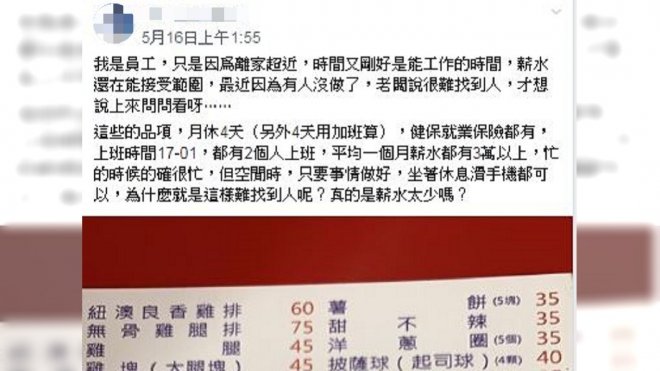 從他貼出來的內容可以看到,店裡每月休息4天,另外4天以「加班」來計算,工作時間則是晚班,從下午5點到凌晨1點,固定都會安排2個人一起上班。至於薪資,則是每月3萬以上,無論健保還是就業保險,也一樣都不少。原PO還以自身經驗分享,表示店裡雖然有時候真的很忙,但空閒的時候,只要做好事情,就都可以坐著休息,甚至滑手機都沒問題,只是無奈都沒人應徵,「為什麼就是這樣難找到人呢?真的是薪水太少嗎?」