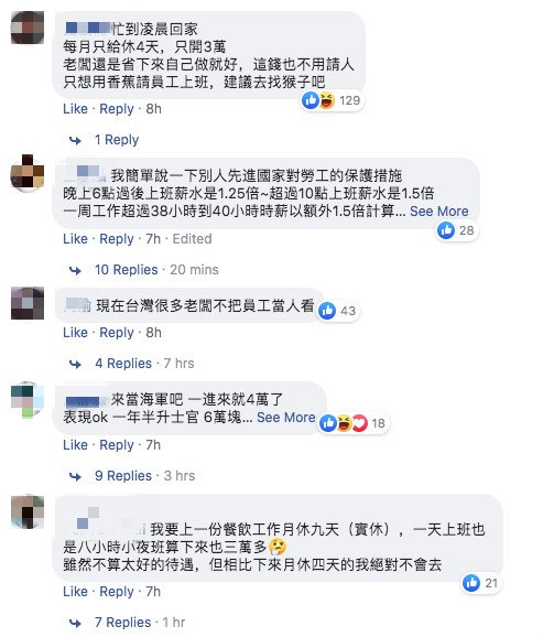 不過,也有許多做過餐飲的網友好心給出意見,表示「現在餐飲業沒有月休8天、實領30k,是很難請到人的」、「做吃的月休起碼都是6~10天」、「我做過很多工作,但只有快遞公司才會月休4天而已。」
