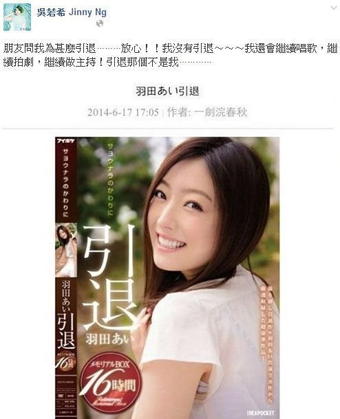 Stephy喺電影《72家租客》反扮吉澤明步!吳若希 VS 羽田愛歌手吳若希早年出道時,就被指與日本AV女優羽田愛撞樣,所以網民幫佢改咗個花名做「羽田若希」!2014年時羽田愛宣布引退,吳若希仲喺FB post咗張羽田愛「引退作」的圖片,幽自己一默話自己冇引退,叫大家放心~