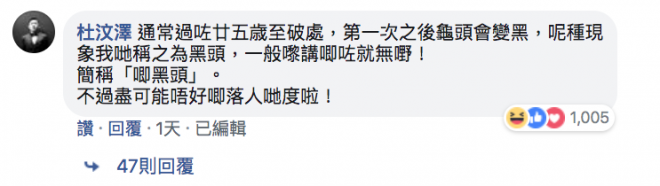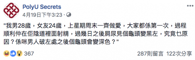 近日Facebook群組PolyU Secrets中就有一個帖文引起激烈討論,連杜生都加入留言惡搞,帖文內容就關於一個處男同女友搞完嘢,過幾日發現自己個龜頭變黑咗,就上網搵網友解答,網友的妙答引發一連串的笑料。
