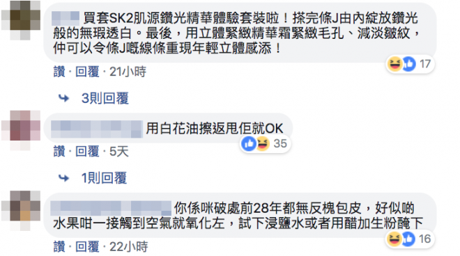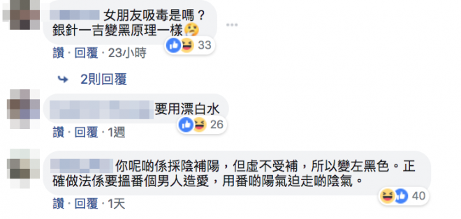 網友稱可幫忙作法解決有人叫用漂白水(危險動作切勿模仿),亦有人話虛不受補,只要搵個男人做愛就可以逼走道陰氣,就唔會再係黑色。
